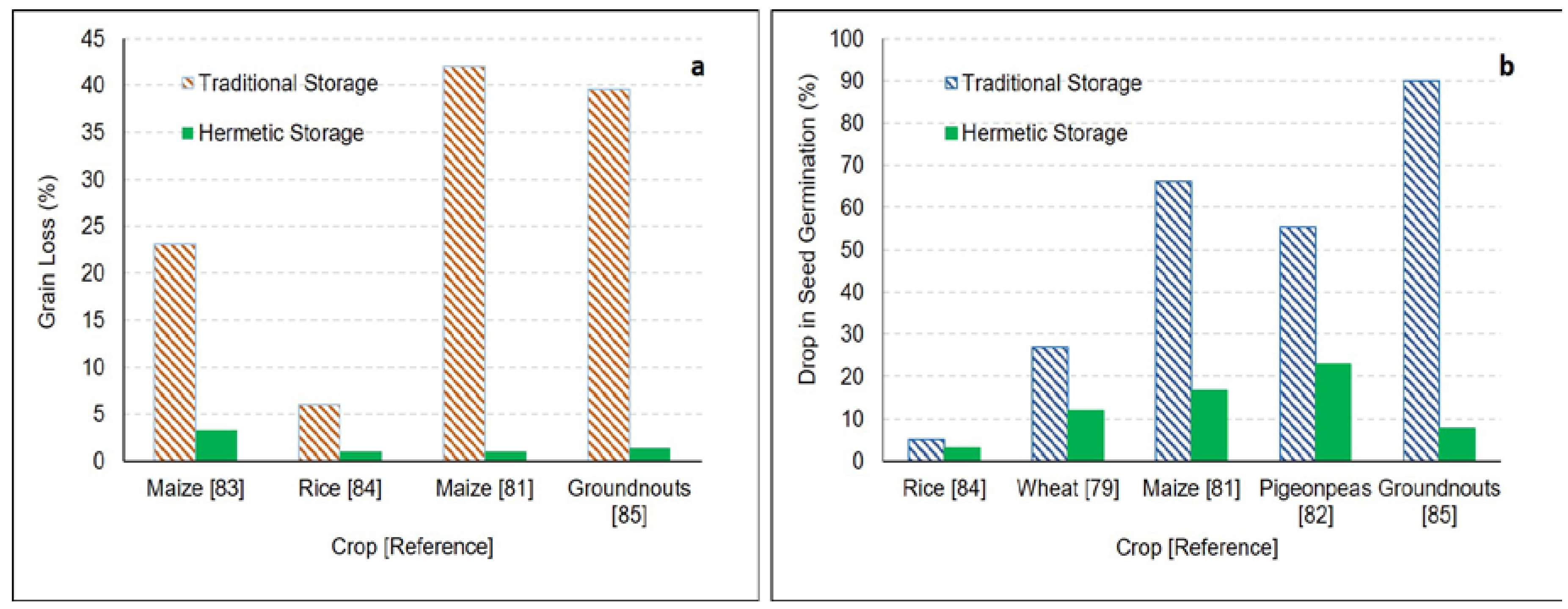 Amount of losses (a) weight loss; (b) seed germination losses, for various grains due to natural or artificial insect infestation during storage in traditional storage vs. hermetic storage (in the case of a range of losses, an average of the losses was used).