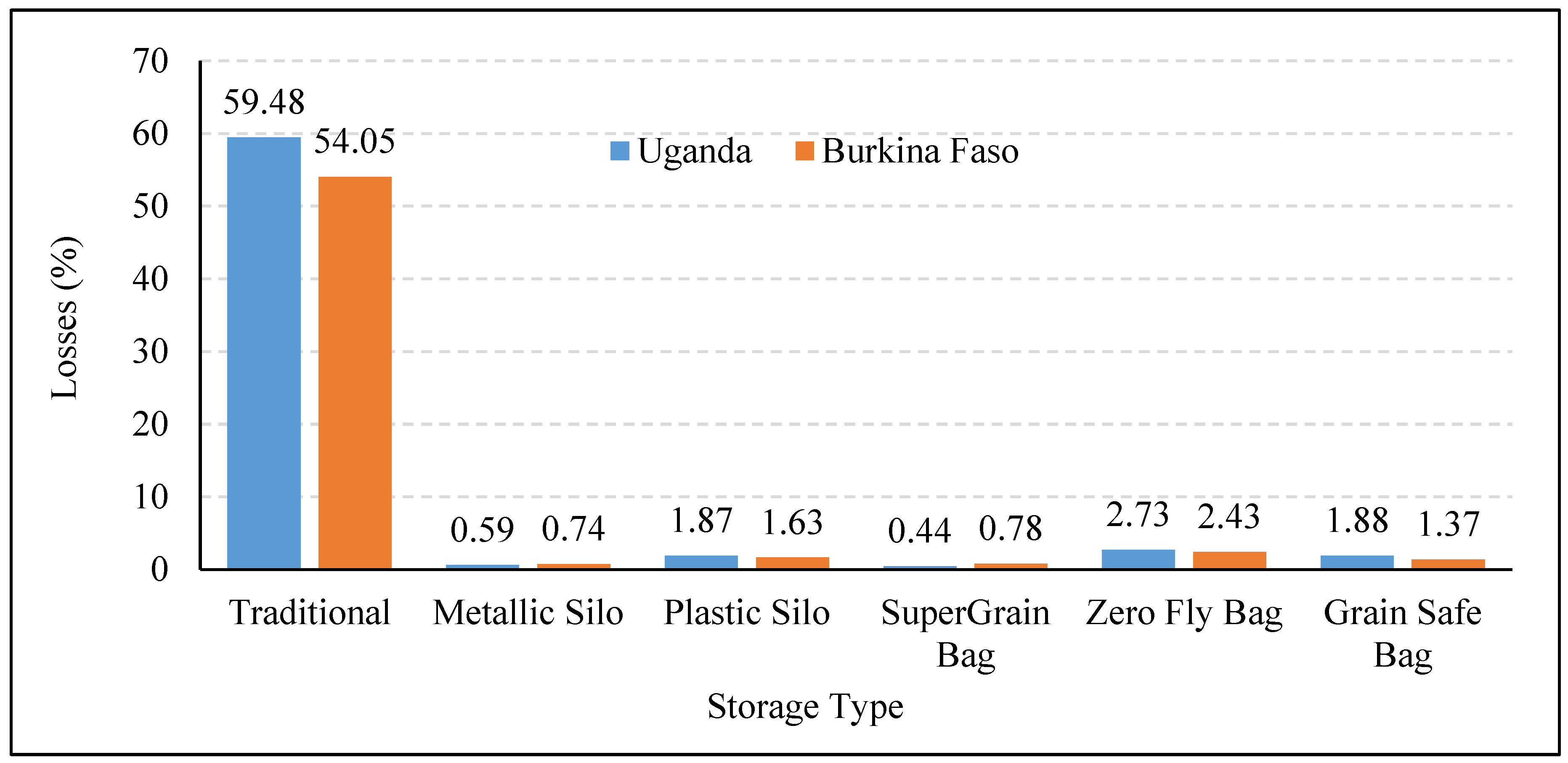 Figure 5 illustrates the effectiveness of various storage options compared to traditional polypropylene bags in reducing the losses of maize grains after 90 days of storage [31]. It can be clearly observed that losses in all new storage techniques were significantly lower than those in the traditional storage, with the minimum being in the case of metallic silos. A nationwide study on postharvest losses of rice in China reported 7%–13% grain losses at the rural household storage facilities, compared to only 0.2% losses at the national reserve level using scientific storage structures [64].