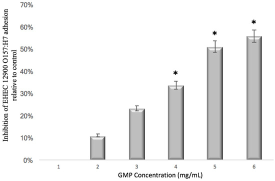 The effect of GMP concentration on inhibition of adhesion of EHEC 12900 O157:H7 to HT-29 cells (* p < 0.05). EHEC = enterohemorrhagic E. coli; GMP = Glycomacropeptide.