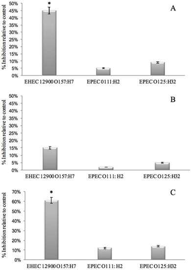 It is known that E. coli adhere to epithelial cells of the intestine using adhesins such as pili and fimbriae, as well as capsular material found on the bacterial cells’ surfaces, and that these receptors adhere to specific glycosylated ligands found on intestinal epithelial cell surfaces [38,39]. Sialic acids and mannose have been found to be important specific host-cell receptors for the initial phase of infection (adhesion of lectins on the surface of bacteria to specific receptors on host cell [3,39,40,41,42]). Therefore, the current study and previous studies [30,43] further confirm that the bovine milk glycopeptide GMP, which contains multiple sialic acid residues, may inhibit the colonisation of intestinal cell lines by mimicking receptor sites on eukaryotic cell membranes, thereby blocking bacterial infection. Rhoades et al. [2] demonstrated that GMP did not significantly inhibit the adhesion of EPEC O111:H27 to ileal mucosa tissues obtained from piglets. However, in the present study, EPEC O111:H2 adhesion was significantly decreased. Therefore, the difference in anti-adhesive activity of GMP amongst E. coli strains could in part be flagella mediated. The results from the current study and previous studies suggest that GMP interacts with the bacterial surface and not the mammalian cell surface. Further studies are required in order to determine if GMP is blocking the bacteria and stopping cellular interactions solely as a mode of action, or if bacterial cell surface changes are occurring also in its presence (e.g., upregulation or downregulation of adhesin expression).