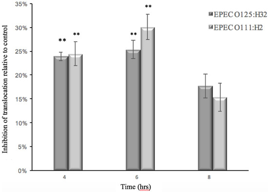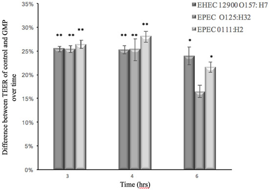 In order to monitor the ability of GMP to prevent barrier dysfunction, the TEER of Caco-2 cells infected with EHEC or EPEC was measured in the absence and presence of GMP. The ability of the E. coli strains to translocate through the cell monolayer was also measured at various time points. At 3 h post-infection with EPEC and EHEC strains, the TEER measurement of Caco-2 cells was reduced, which indicated an alteration of membrane integrity (Figure 3). Simultaneously, each of the bacteria tested—EPEC 0111:H2 and 0125:H32—penetrated the Caco-2 cell monolayer and were found in the basolateral medium 4 hours after inoculation, and bacterial numbers continued to increase over time (Figure 4). EHEC 12900 failed to penetrate the Caco-2 polarized monolayer and translocate into the basolateral media in both treated and control transwells. After 14 h, GMP’s inhibitory activity ceased, and at this point both the test and control membranes had a TEER of less than 145 Ω, which is the approximate TEER of an un-seeded well (no cell line). A decrease in TEER suggested that each strain of E. coli disrupted the tight junctions (TJs) of Caco-2 monolayers. GMP significantly delayed both the EHEC- and EPEC-induced decrease in TEER for 3 h (p < 0.01 and p < 0.05, respectively) (Figure 3). GMP also significantly inhibited translocation of both EPEC strains through Caco-2 monolayers into the basolateral medium for a period of 2 h (p < 0.01) (Figure 4).