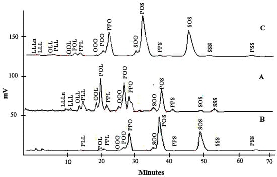 The chromatogram of lard (A), cocoa butter (B), and their admixture (C).