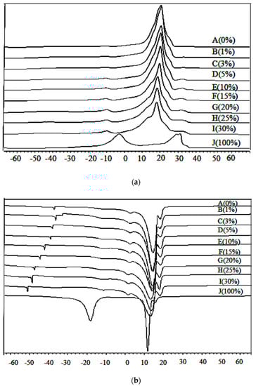 The DSC representative heating thermograms of lard, cocoa butter, and their admixtures in a range of 1% to 30% are as shown in Figure 2a. Lard and cocoa butter were totally different in their heating profiles. Lard (J) had two major peaks which appeared at −4.00 °C and 28.78 °C and a small shoulder peak at 34.09 °C. The heating thermal properties were acquired at the onset of the exothermal reaction, at the offset of the endothermal reaction, the peaks, and enthalpy. There is a significant difference (p < 0.05) between the heating enthalpy of lard (29.86 J/g) and cocoa butter (86.81 J/g). Cocoa butter (A) exhibited the highest Toff (23.38 °C) which could be due to a larger, highly saturated lipid fraction which melted at a higher temperature compared to those of more unsaturated lipids. Lard exhibited lower Ton (−10.30 °C) values, which indicated a higher amount of unsaturated fatty acid.