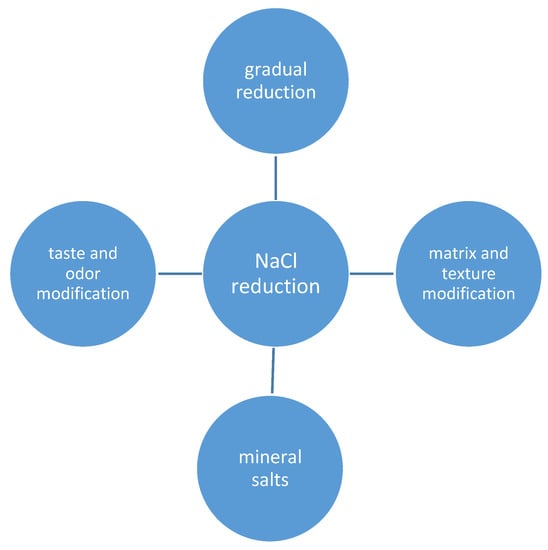 Few examples of recent studies concerning different options for salt reduction are reviewed here. The most obvious and simplest option is to reduce the salt content of the products. The levels of salt reduction between products, as well as study protocols in sensory laboratories or real-life conditions, have varied, and some examples are discussed here. A consumer panel in a sensory laboratory evaluated reduced-sodium cheddar and mozzarella cheeses, and it was found that consumers could distinguish a 30% salt reduction [40]. In meat products evaluated by a trained sensory panel, the sensory parameters most affected by the salt reduction were salty taste, juiciness and texture. In sausages and ham, moderate salt reduction did not have a significant effect on the sensory quality, while bacon and salami were significantly affected after a moderate reduction [41].