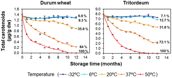 Evolution of the total carotenoid content (μg/g dry weight) in durum wheat (Don Pedro variety) and tritordeum (HT621 advanced line) whole-grain flours during long-term storage under temperature controlled conditions (−32, 6, 20, 37 and 50 °C). The values shown are the mean and standard error (n = 5 for the starting sample, n = 3 for the rest of the samples). Pigment losses (%) are indicated at the end of storage.