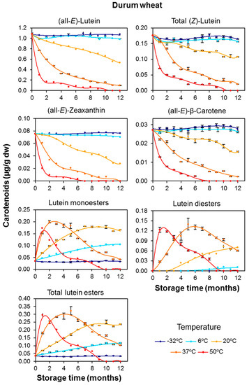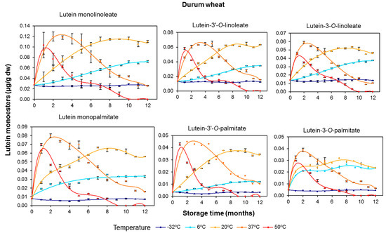 In contrast to the free carotenoids, the lutein esters showed increased levels with increasing temperature. This distinction was particularly striking for durum wheat, and especially the monoester fraction, stored at the milder conditions of 6 and 20 °C (Figure 2). For example, the concentration of lutein monoesters increased by 3.7 and 5.7 times the initial values after 12 months at 6 and 20 °C, respectively. At the higher temperatures (37 and 50 °C), competition and/or compensation was observed between the increases promoted by the temperature (de novo esterification) and decreases caused by oxidative degradation. After the storage of durum wheat for 12 months, concentration increases of 2–3 fold were recorded at 37 °C for the lutein ester fraction (sum of monoesters and diesters), revealing an intense esterifying activity under these conditions. The concomitant formation of lutein diesters associated with the rise in storage temperature and time was prompted by the increase in the pool of monoesters.