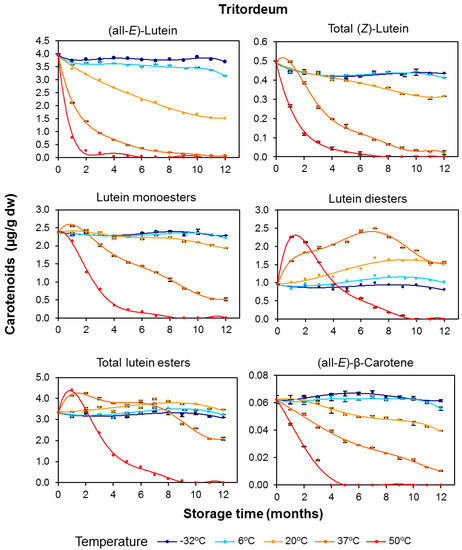 For whole-grain tritordeum flour, greater losses of the individual free pigments were also observed at the higher storage temperatures (Figure 3). For tritordeum flour stored at 37 °C, (all-E)-lutein, (Z)-lutein, and (all-E)-β-carotene had decreased by 83–98% by the end of the 12-month storage period (Table S2). Similar to durum wheat, the total pigments in tritordeum were completely destroyed after 10 months of storage at 50 °C, and (all-E)-β-carotene was already undetectable after 4 months.