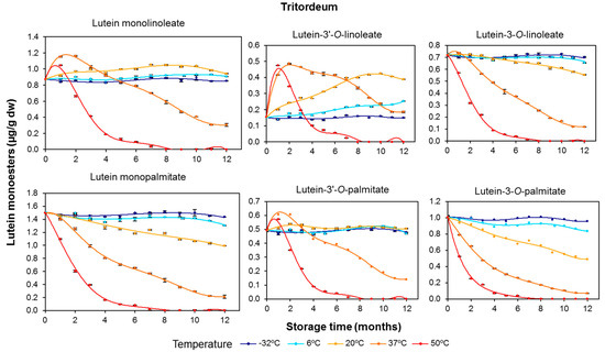 In tritordeum, the maximum concentration increase for lutein monolinoleate was registered after two months at 37 °C and one month at 50 °C (Figure 5). In contrast to durum wheat, stability differences between both monoesters were observed in tritordeum. Lutein monolinoleate remained mostly constant at −32, 6, and 20 °C, whereas lutein monopalmitate showed a progressive decrease with increasing temperature and storage time. Nevertheless, the degradation rates for lutein monoesters were consistently lower than the rates recorded for free lutein (Figure 3). The degradation after 12 months at 37 °C was greater for lutein monopalmitate (85.9%) than for lutein monolinoleate (65.1%).