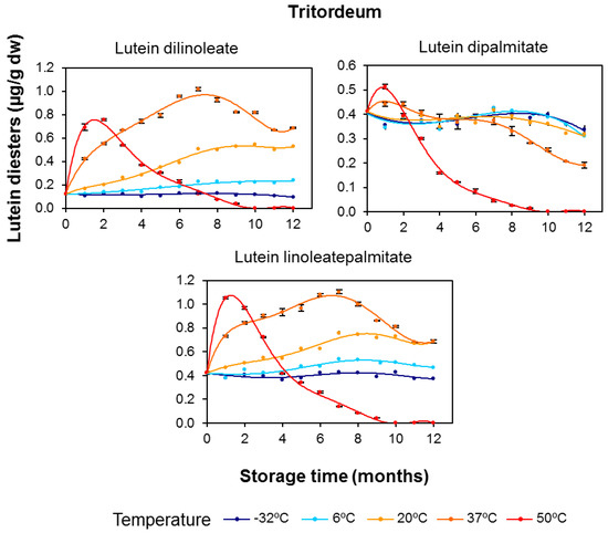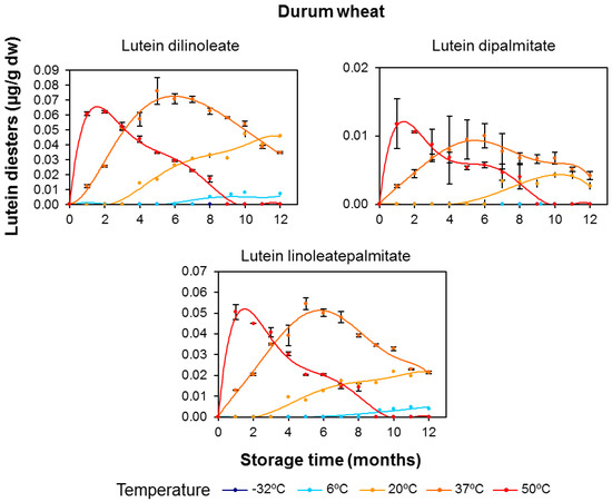 In both cereal flours, lutein diesters presented remarkable net increases during the duration of the storage period, especially for lutein dilinoleate and particularly at the storage temperature of 37 °C (Figure 6 and Figure 7). The evolution of diesterified xanthophylls over the storage period clearly suggests that their formation is due to induction of the esterification process by temperature, with this synthesis being particularly prominent in durum wheat. As the storage temperature increased, the rate and amounts of synthesis were also increased, but, on the other hand, the degradative processes due to oxidative stress were also induced. Interestingly, the higher the degree of esterification (diester > monoester > free), the higher the xanthophyll’s stability and, consequently, the more delayed the degradation (Figure 4 and Figure 6 for durum wheat and Figure 5 and Figure 7 for tritordeum).