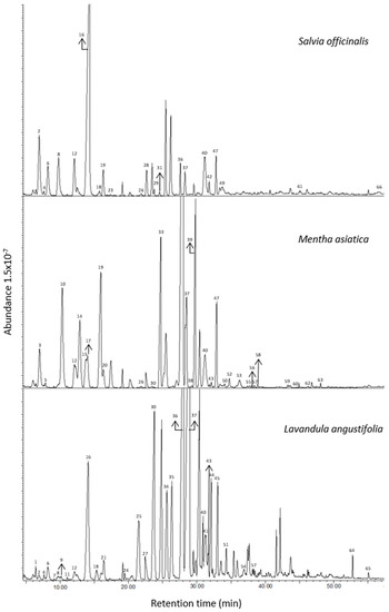 The gas chromatography–mass spectrometry (GC–MS) chromatograms of Salvia officinalis Lavandula angustifolia and Mentha asiatica (Peak numbers refer to Table 1).