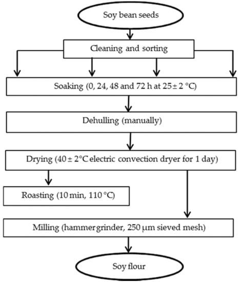 The soybean seeds used in this study were purchased from local markets in Ngaoundere, Cameroon. The dried seeds (moisture content ≈ 11%) were carefully cleaned and sorted out to remove defective and small-sized seeds so as to obtain clean seeds of uniform size. The cleaned seeds were then processed into flour, as shown in Figure 1. The seed sample was divided into four subsamples, which were steeped in tap water (2 kg/8 L) at ambient temperature (25 ± 4 °C) for 0, 24, 48, or 72 h. Soaked seeds were manually dehulled, spread in a single layer on aluminum racks, and dried at an average temperature of 40 ± 2 °C for 1 day in a gas dryer. The dehulled subsamples were each further divided into two subsamples, from which one was roasted at 110 °C for 10 min, and the second was left unroasted. Each of the resulting eight subsamples was then milled into fine flour using a hammer electric grinder (Culatti, Polymix, France) equipped with a sieve of diameter 250 µm meshes. Flours so produced were sealed in polyethylene bags and stored at 4 °C until required for analysis.