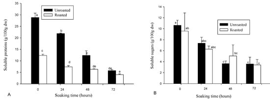 (A) Soluble protein; and (B) Soluble sugar contents of soybean flour, as affected by soaking time and roasting. Bars bearing different letters are significantly different at p < 0.05; n = 3.