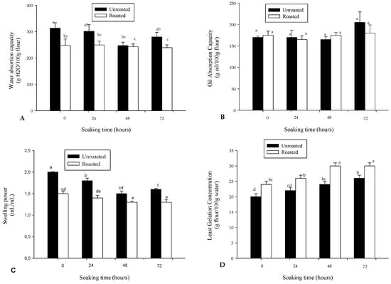 Variation in (A) Water absorption capacity; (B) Oil absorption capacity; (C) Swelling power; and (D) Least gelation concentration of roasted and unroasted soybean flour as a function of soaking time. Bars bearing different letters are significantly different at p < 0.05; n = 3.
