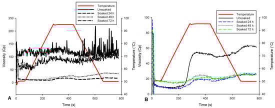Viscoamylograph profiles of (A) unroasted; and (B) roasted soaked and unsoaked soybean flour.
