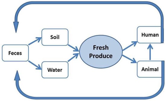 L. monocytogenes is present in many animals and humans [,], so it is possible to isolate the bacterium from the feces of these sources and in their environment [,,]. Moreover, fresh produce and soil can be contaminated by sewage water applied as fertilizer to the crop plants []. Thus, L. monocytogenes can be recycled among vegetables, humans and soils contaminated with feces (Figure 1). This bacterium has an interesting life cycle adaptation capability. It lives a saprophytic life in the soil but can make the transition into a pathogenic life when it enters into human or animal cells []. The transition from a saprophyte to a cytosolic pathogen occurs through careful modulation of the activity of a specific regulatory protein (PrfA) and the type of available carbon source.