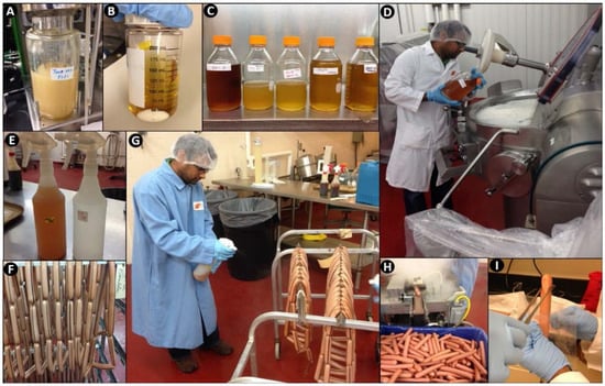Manufacture of hotdogs for bacteriocin treatment. (A) Culturing microorganisms; (B) centrifugation of Bac+ supernatants; (C) pasteurized Bac+ CFS; (D) addition of Bac+ CFS mixture to hotdog meat matrix (Trial #2); (E) spray bottles with pasteurized Bac+ CFS; (F) pre-cooked hotdogs in casings; (G) spraying cooked hotdogs in casings with Bac+ CFS mixture (Trial #2); (H) hotdogs after peeling; (I) addition of hotdogs to vacuum package bags for addition of Bac+ CFS and the L. monocytogenes inoculum (Trials #3, #4, and #5).