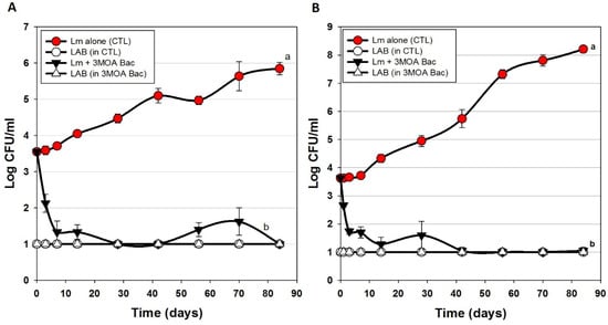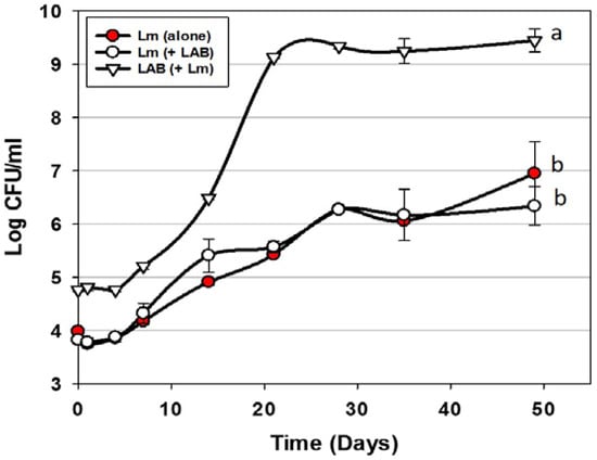 ) or in combination (Lm+LAB; ○) with 5 Bac+ LAB (En. faecium FS56-1, En. thailandicus FS92, En. faecium FS97-2, En. thailandicus RP-1, and Pe. acidilactici Bac 3). All trials were performed in triplicate replication; data points represent the means and error bars represent standard deviation from the mean. Treatments with different letters are significantly different (repeated measures, p < 0.05); those with the same letters are not significantly different (p > 0.05).