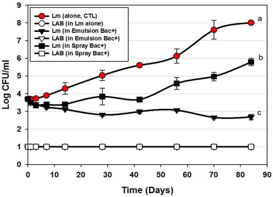 L. monocytogenes 39-2 challenge study on hotdogs with multiple MOA Bac+ CFS held at 5 °C for up to 84 days in vacuum packages (Trial #2). L. monocytogenes 39-2 was inoculated onto untreated hotdogs (Lm, alone), inoculated onto hotdogs in which the bacteriocin mixture was mixed into the meat emulsion during manufacture (in emulsion Bac+), or inoculated onto hotdogs in which the bacteriocin mixture was previously sprayed while hotdogs were still in casings before peeling (in spray Bac+). The Bac+ CFS was comprised of curvaticin FS47, curvaticin Beef3, pediocin Bac3, and lacticin FLS1. Platings for LAB from all treatments were made on acidified MRS (hollow symbols). All sample treatments were performed in triplicate replication; data points represent the means and error bars represent the standard deviation from the means. Treatments with different letters are significantly different (repeated measures, p < 0.05).
