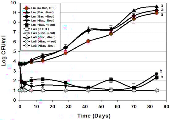 Since LAB bacteriocin culture extracts may also contain lactic acid, we further examined the use of neutralized vs. non-neutralized CFS from both Bac+ (bacteriocin treatment) and bacteriocin-negative (Bac−, control) LAB in order to more confidently assert the inhibition to bacteriocin-related antimicrobial activity (Figure 6). The use of Bac− LAB culture extract (Lb. delbrueckii 4797) was an additional control treatment to evaluate whether lactic acid produced by cultures (without the influence of bacteriocin) was contributory to the inhibition observed in these assays as we have observed a contributory effect of lactic acid in culture extracts in microplate in vitro assays [].