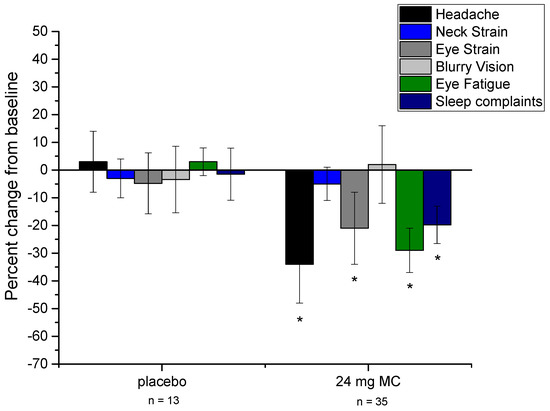 Percent change from baseline for physical indicators of excessive screen time (ST) (including sleep quality), at 6 months for both placebo and treatment groups. Error bars are +/− 1 SD. Asterisks denote statistically significant difference from placebo (p < 0.05).