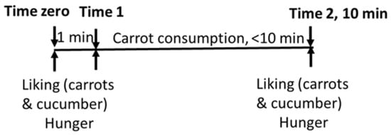 Figure 1 illustrates the flow of each session. During the test, children were given 10 min to eat as many carrots as they liked (time 1 to time 2 in Figure 1). Similar time frames were used in a previous study [34]. On each test day children started with rating their hunger levels, after which they were presented with carrots and cucumber in a balanced order (time zero in Figure 1). Children tasted and rated their liking of each of the vegetables after which all vegetables were removed from the table. Next, the ad libitum consumption took place: a box of 500 g of carrots was offered to each child with the instructions to eat as much or as little as they wanted (time 1). Children were instructed to keep the box in their lap, so it was always in sight. Children were asked to pay close attention to what they ate and were reminded to focus on their eating by the interviewers if necessary. When a child stopped eating prior to the 10 min testing limit, he or she was asked if he/she had finished eating. If the child said he or she had finished, the interviewer would ask again if he/she had finished eating. This continued until the child said he or she had finished eating on three consecutive occasions, after which the test was terminated. If the child still wanted to consume carrots after the time limit of 10 min lapsed, the researcher made a note of it and told the child that he/she had to stop eating. After the children stopped eating carrots, each rated their liking of carrots and cucumber (time 2). Children were not made aware that there was a time limit, however on the second day children might have expected that they were only allowed to eat carrots for 10 min. The box with carrots was weighed at time 1 and time 2.