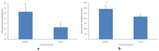 (a) panel-time (mean ± SEM) children spent eating carrots in seconds. (b) panel-amount children consumed (mean ± SEM) during 10 min. Shown for children who finished their consumption of whole and diced carrots before the 10 min time limit n = 36. * p < 0.05, ^ p = 0.06.