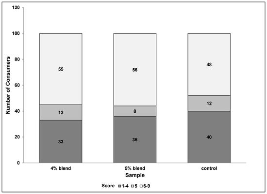 In Figure 1, the overall liking scores have been grouped for each of the three samples. These data are a good supplement to the mean averages because it shows if there are any outliers that are skewing the results. Over half of the consumers, 56% and 55%, respectively, rated the overall liking at least a “6” (at least liked slightly) for the 5% blend and 4% blend, whereas only 48% of consumers rated the control that high. This suggests that the spice blend increased overall liking for the average consumer, increasing overall acceptability.