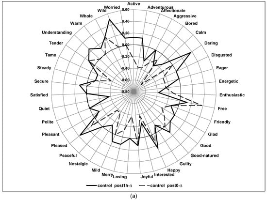 Figure 2 highlights the differences between samples for emotions over time (post0-∆ scores vs. post1h-∆ scores). For the control (Figure 2a), the post1h-∆ scores were slightly higher than post0-∆ scores, in general. In most cases, the pre-consumption emotion scores were more intense than the post and post1h emotion scores as many of the peaks and valleys were either near or below 0.00. The post1h-∆ scores had large positive peaks for the terms, ‘Wild,’ ‘Daring’, and ‘Adventurous’, while the post0-∆ score had a large positive peak for the emotion ‘Free.’