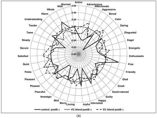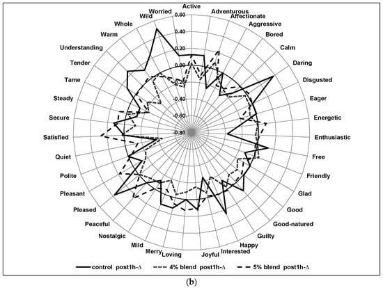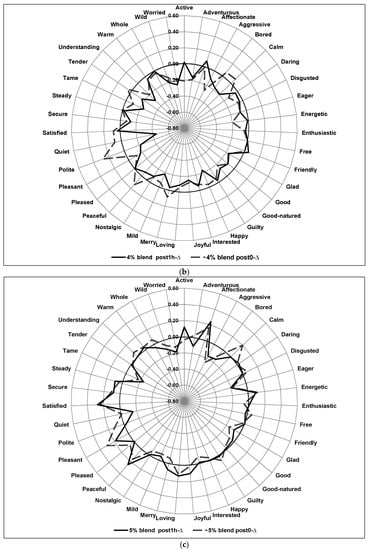 Figure 2b,c shows the post0-∆ scores vs. post1h-∆ scores for the 4% blend and 5% blend, respectively. For the 4% and 5% blends, the post0-∆ scores are slightly higher than post1h-∆ scores, in general. This is opposite to the trend for the control sample as the post1h-∆ scores were slightly higher than post0-∆ scores for that sample. Also noteworthy is the observation that the range of the delta scores is narrower for the 4% and 5% blends, in general, when compared to the control. For the 4% blend, the emotion terms that stand out are: ‘Calm’, ‘Bored’, ‘Peaceful’, Polite’, and ‘Quiet’. For the 5% blend, ‘Satisfied’, ‘Pleasant’, ‘Peaceful’, and ‘Affectionate’ stood out as both the post0-∆ scores and post1h-∆ scores had large, positive peaks. The significance of the differences in the intensity of these emotions in this particular context deserves future research in order to gain a better understanding of their particular meaning. The terms may have a significant impact on product acceptance or prove a way to more fully understand a particular product.