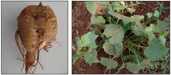 Ethiopia is a biodiversity hotspot, thanks to its highly diversified climate and edaphic conditions. More than 6000 flora species residing in 23 different vegetation types have been recognised in the country, of which 12% of the species are indigenous [1]. The indigeneity is particularly high on the highlands of southwestern and western regions. Coffee (Coffea arabica), safflower (Carthamus tinctorius), tef (Eragrostis tef), noug (Guizotia abyssinica), and enset (Ensete ventricosum) are some of the examples of crops which have originated in Ethiopia. Apart from cereals and pulses, Ethiopian agroecosystems are highly suitable for the production of high-quality roots and tubers. Getahun [2] listed about 30 edible starchy root and tuber crops from Ethiopia. Coccinia abyssinica (Lam.) Cogn., commonly known by its vernacular name anchote (Figure 1), is one of these root and tuber crops. Cultivation of anchote is particularly widespread in the western and southwestern regions of the country, at varying elevations of 1300–2800 m with an annual rainfall of 762–1016 mm [3,4].