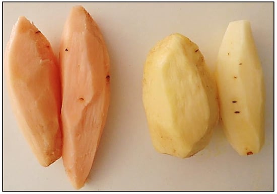 Fifteen tubers (five tubers per replica) of each anchote tuber accession (red and white) were collected randomly from a one-day-old harvest at a local vegetable market in Nekemte and a neighbouring town (Negassa). Red and white parenchyma tissues of anchote are illustrated in Figure 3. It is hard to distinguish red and white tissue anchote from its external appearance; hence a small portion of the corky skin was removed to identify underlying red and white parenchyma tissue visually. However, in most cases, the tubers which have been transported to retail market have skinning injuries and small bruises due to improper packaging and handling which makes it easier to select the two colour accessions. Tubers were packed in paper bags and transported to the Ethiopian Institute of Agricultural Research (EIAR) and the Ethiopian Public Health Institute (EPHI), Addis Ababa, for further preparation and analysis. To some degree, International Potato Center (CIP) guidelines [14,15] for sample collection and preparation were followed, which involved first washing the tubers (with tap water) to remove all soil residues and then rinsing with distilled before drying the unpeeled tubers with a clean paper towel. Tubers were peeled with a high-grade stainless steel handheld peeler, and were again washed with distilled water and dried using a paper towel before they were sliced using a high-grade stainless steel knife. Due to the unavailability of a freeze dryer, low-temperature oven drying (at 40 °C for 72 h) was employed to obtain dehydrated samples with a moisture content below ~10%. The dried samples were milled using a stainless steel mill and packed and stored (at room temperature) into sealed plastic bags for proximate and mineral analysis.