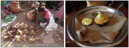Display of anchote tuber with other crops at a local vegetable market in Nekemte (left), and a typical anchote dish (namely special anchote, with butter, Jogurt, and Injera (local bread)) (right). (Picture by Aditya Parmar).