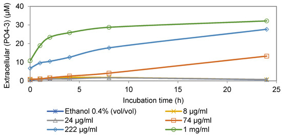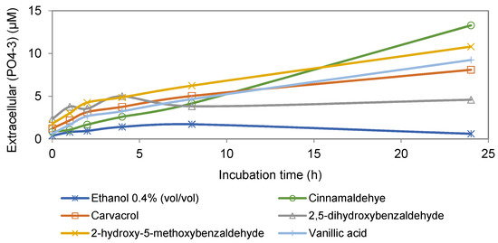 Extracellular concentration of phosphate ion in cultures of Map incubated with different active compounds, non-inhibitory compound (vanillic acid) at 74 mg/L, and non-inhibitory concentration of ethanol (0.4%, v/v).