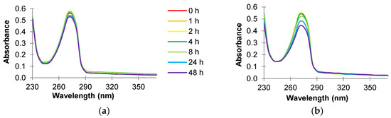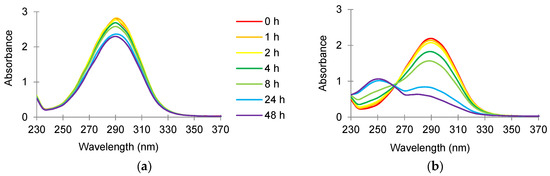 Absorbance scan (230 to 370 nm) of 24 mg/L cinnamaldehyde prepared in sterile reverse osmosis water and incubated in (a) absence of and (b) presence of Map NCTC 8578 at 37 °C for 48 h.