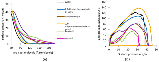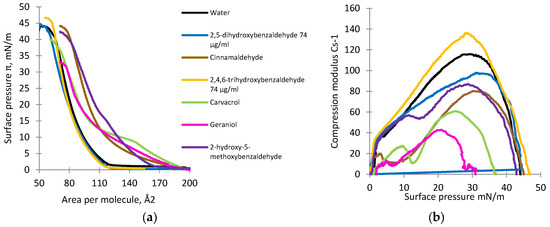Isotherms of DOPG deposited on the subphase with natural antimicrobial compounds showed the lift-off value varied from approximately 117 to 195 Å2 per molecule (Figure 6a). In the presence of two of the oil compounds, carvacrol and geraniol, the slopes of the isotherms were the flattest. 2,4,6-Trihydroxybenzaldehyde and 2,5-dihydroxybenzaldehyde caused a non-significant decrease in the lift-off value (p > 0.05). For the DOPG monolayer compressed on a subphase containing pure water only, the maximal value of CS−1 was observed at approximately 118 mN/m, whereas the value for 2,4,6-trihydroxybenzaldehyde was approximately 137 mN/m, indicating a rigidifying effect (Figure 6b). For the other compounds, the maximal values of the compression modulus varied from 42 to 117 mN/m. Geraniol showed the highest fluidizing effect, whereas 2,5-dihydroxybenzaldehyde showed the lowest effect.