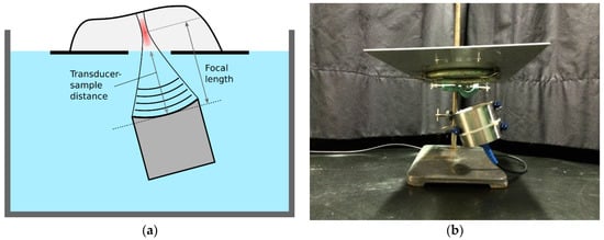 HIFU setup with a transducer and plate to hold the fillet. (a) Schematic illustration with a transducer placed in a water bath; (b) Image showing a transducer and plate mounted to a metal stand.