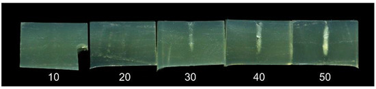The results are shown in Figure 4. When the transducer is close to the sample, most of the heat is dissipated in the upper surface of the phantom, with denaturation causing a bright spot and a depression in the surface. With increasing distance, the denatured area extends further into the phantom, and at a 60 mm distance, when the focal point is centered in the phantom, the denatured area has a “cigar” shape. This shape corresponds to that observed in the application of HIFU in medicine, under ideal conditions [12]. However, at distances of 65 mm and above, there is no visible denaturation inside the phantom, but rather a series of small holes on the bottom surface of the phantom. When the focal point is close to the water-phantom interface, the sound field seems to have a kind of “hammering” effect rather than a heating effect.