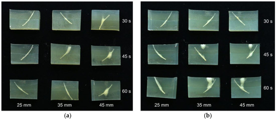 Slices of phantoms with embedded bones, treated at a 25–45 mm distance and for 30–60 s. The phantom temperature was approx. 4 °C before treatment. (a) Treated with a 680 kHz transducer; (b) Treated with a 1 MHz transducer.