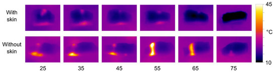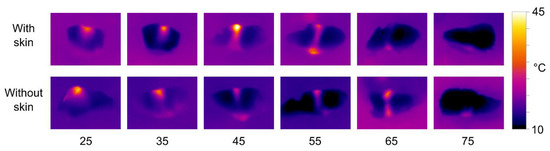 The thermal images clearly show that there is a significantly stronger heating effect in samples without skin compared to skinned fillets. The heat distribution is also affected by the transducer-sample distance, with short distances resulting in more heat dissipation at the upper surface, and longer distances resulting in more heat dissipating at the lower surface. However, the patterns of heat distribution are less pronounced than what was observed with the phantoms. There is a tendency for most of the heat to be dissipated at the lower surface, i.e., the side closest to the transducer. Using the 680 kHz transducer on skinned fillets, a distance of 55 mm produced significant heating throughout the samples.