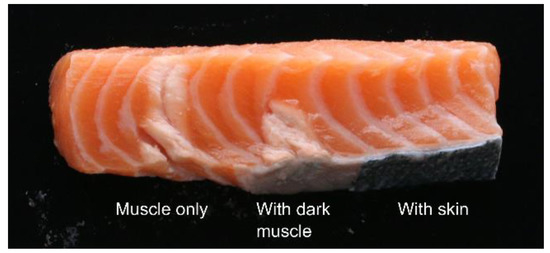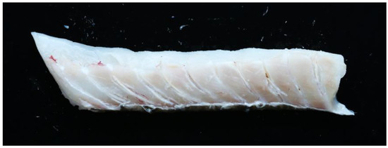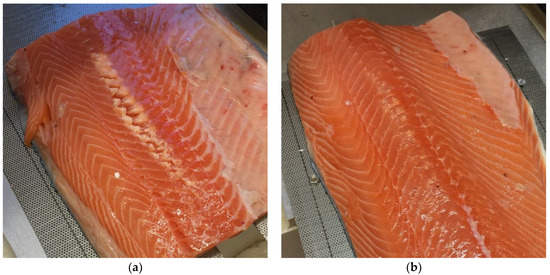 Fish muscle consists of a number of segments, called myomeres, separated by layers of connective tissue (CT), called myosepta. The smaller muscle segments converge at a thick layer of CT called the horizontal septum, dividing the muscles on the back of the fish (epaxial muscles) from the muscles on the belly side (hypaxial muscles). The horizontal septum can further be described as an array of tendons connecting the backbone to the skin [1]. In cod, the pin bones are embedded in this lattice of tendons in the horizontal septum, whereas in salmon, the pin bones are embedded in the epaxial muscles [2,3]. From a fish processing perspective, this means that for cod, the pin bones are positioned between the loin and belly parts of the fillet, while for salmon, the pin bones are positioned within the loin part. This is illustrated in Figure 1. The typical number of pin bones per fillet is approximately 17 for cod [2] and 30 for salmon [4,5].