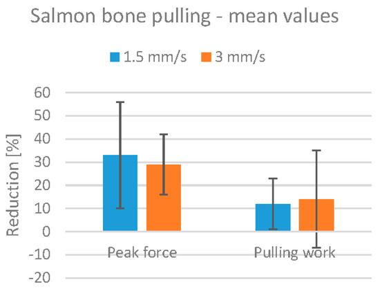 Mean values for the reduction of bone pulling force and work in salmon fillets, with error bars marking corresponding mean standard deviation values. Reduction percentages are calculated relative to the control fillet from the same fish.