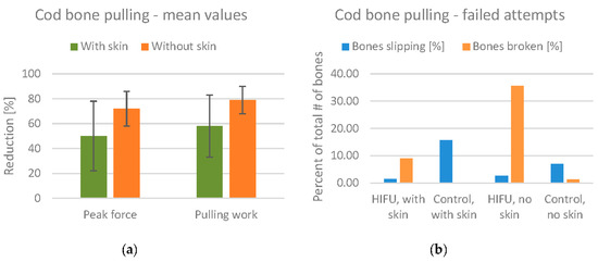 The mean values for the reduction of pulling force/work are shown in Figure 14a. The mean reduction in the peak pulling force is 50% for fillets with skin, and 72% for fillets without skin. Note also that the standard deviation is lower for fillets without skin.