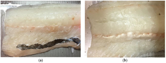 Example of a cod fillet after HIFU treatment. (a) Fillet with skin: A small amount of white denaturated muscle visible along the bone row; (b) Fillet without skin. Denaturation is clearly visible along the bone row, and some bones are burned.