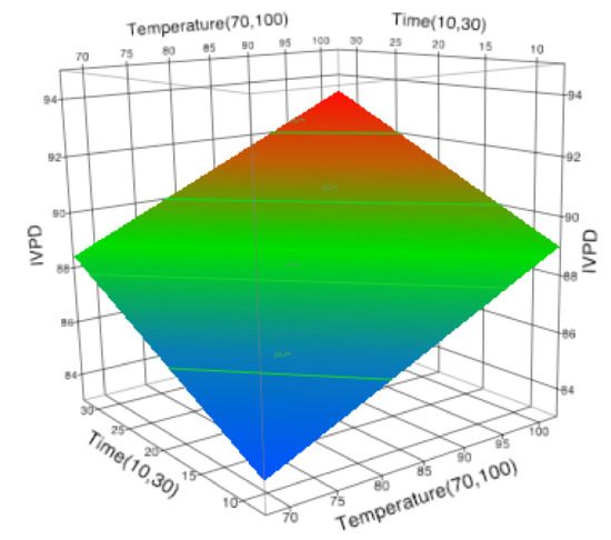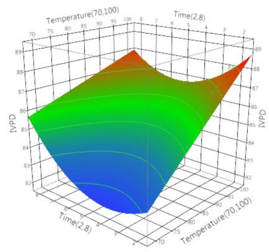 Effect of time (min) and temperature (°C) on in vitro protein digestibility (IVPD) of soymilk during microwave processing.