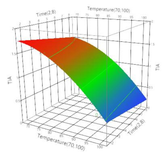 Trypsin inhibitor activity (TIA) governs the nutritional value of soymilk protein [61,62]. The average values for TIA during microwave and conventional processing is mentioned in Table 7. It has been reported by several researchers that overheating for complete removal of TIA reduces the overall nutritive value of soybeans [63]. Hence, a precise, controlled thermal process or a novel process is required for preparation of soymilk with maximum nutritive value. In this study analysis of the effect of microwave and conventional processing of soymilk on TIA revealed that both temperature and time play a significant (p < 0.05) role in determining it. Table 8 presents the ANOVA analysis for the effect of temperature and time on TIA for microwave processing. From the table, we can observe that regression model developed was significant with (p < 0.0001), insignificant lack of fit (p > 0.05) and R2 of 0.91 and that the independent factors temperature, its square term and time played a significant role. The regression coefficient analysis also supported the aforementioned observation, where temperature with regression coefficient estimate of −0.558, followed by its cross term with regression coefficient estimate of −0.192 and lastly time with a regression coefficient of −0.108 suggested that TIA decreases with increase in temperature and time (Figure 3), but overall presence of the significant temperature square term suggested temperatures significant influence on TIA. According to Rajko et al., inactivation of trypsin inhibitors requires more absorbed heat energy for longer processing time [64]. Similar experimental results were obtained by Alajaji and El-Adawy, during the microwave oven cooking of chickpea on high temperature for 15 min [58]. According to the studies by Oliveria and Haghighi, reduction in TIA was more pronounced in samples at higher temperatures as was expected because soybean TI loses activity irreversibly in the temperature range 80–110 °C [65]. In addition, studies by Esaka et al., TIA was not detectable after microwave heating at 120 °C for 5 min in case of winged bean seeds [66]. The predictive quadratic equation for effect of microwave processing on TIA was obtained as (Equation (6)).