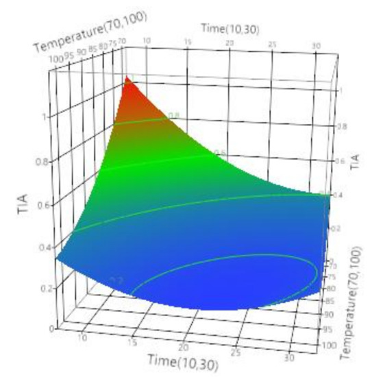 For the conventional process of soymilk and its effect on trypsin inhibitor activity it was observed that all the independent factors and its quadratic or cross terms significantly affected it (p < 0.05). As seen in Table 9, the predictive model generated was significant (p < 0.0001) with insignificant lack of fit and R2 of 0.77. The response surface graph presented in Figure 4 shows that highest TIA was obtained at lowest temperature for shortest processing time. As the processing time was increased, the TIA decreased at any given temperature. This observation can also be confirmed with analysis of regression coefficients of process parameters, which suggested that the most influential parameter was a temperature with regression coefficient estimate of −0.173, followed by time with −0.138, and their cross term with 0.099 and lastly with a square term of time, 0.102, and temperature, 0.099. Similar results were observed in lentil, chickpea and pea flours that were thermally processed by boiling in a water bath at 90 °C for 20 min, which significantly reduced the levels of trypsin inhibitors [67]. According to the results of Osman et al., hydrothermal treatment of Tepary bean extract at 100 °C for 60 min completely inactivated the TI [68]. Similar results were observed by Andrade et al., recommending a dry heat of 200 °C for 20 min for soy flour samples, showing temperature plays an essential role in inactivation of TI [69]. The predictive quadratic regression model generated for conventional processing is presented by Equation (7).