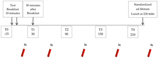 Blood samples were collected 15 min before meals (time 0) and postprandial after 30, 90,150, and 210 min (Figure 1) and saline was infused following blood draws to keep the catheter patent. Pefabloc was added at a final concentration of 1 mg/mL in one of the ethylenediamine tetraacetic acid (EDTA) tubes for the stabilization and measurement of plasma ghrelin, since it is a highly unstable hormone. All samples were directly centrifuged at 2500× g for 15 min at 5 °C. Plasma samples intended for ghrelin measurements were acidified with HCl to a final concentration of 0.05 N. All specimens were stored at −80 °C until further analysis. None of the 16 subjects experienced any particular discomfort during blood withdrawal.