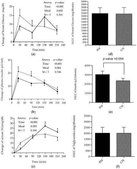 Changes in postprandial serum glucose were significantly different according to time (p < 0.001), but not a meal and time × meal interaction. However, serum glucose of the CM was slightly lower than that of the RM during the first 90 min, though this failed to reach statistical significance. Moreover, at time 150, serum glucose of the CM showed another peak unlike that of the RM. Nonetheless, IAUC for serum glucose changes calculated over 210 min showed no difference following RM and CM meals (Figure 2a).
