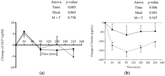 Postprandial changes in plasma glucagon-like peptide 1 (GLP-1) (a) and Ghrelin (b) from baseline following the ingestion of RM and CM meals. Data are expressed as mean values ± SEM. Values with different letters are significantly different at each time point. a p-value < 0.05, b p-value < 0.01. RM: Regular Mankoushe ---▲---; CM: Chickpeas Mankoushe ―■―; M: Meal; T: Time.