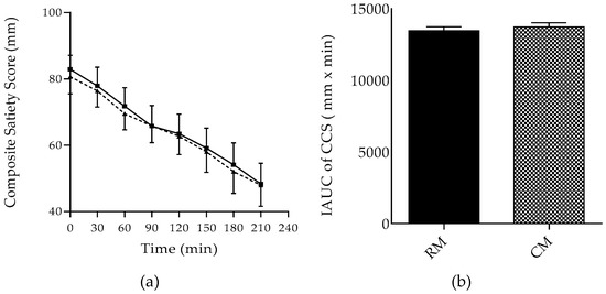 Subjective appetite ratings and CSS values are shown in Figure 4 and Figure 5, respectively. Throughout the experiment, perceptions of hunger and prospective food consumption (PFC) increased, and perceptions of fullness and satiety decreased gradually following the two breakfasts. Within the two breakfasts, the mean values for the four perceptions, Hunger, Fullness, Satiety, and PFC, were comparable (Figure 4). Regarding the CSS, it appeared to decrease similarly following RM and CM, and IAUC for CSS calculated over 210 min showed similar values for both breakfasts (Figure 5). In the present study, almost similar results were noted in the ad libitum pizza meal regarding weight and energy following the two breakfasts. Mean weight and energy content of ad libitum pizza was (233.93 ± 14.94 g, 445.34 ± 20.11 kcal) following RM compared to (232.18 ± 23.78 g, 442 ± 32.02 kcal) following CM. Calorie contents were based on the USDA database [22].